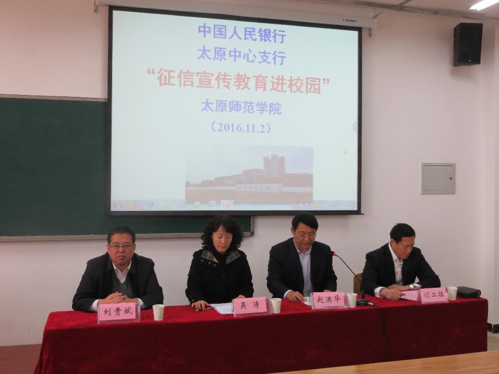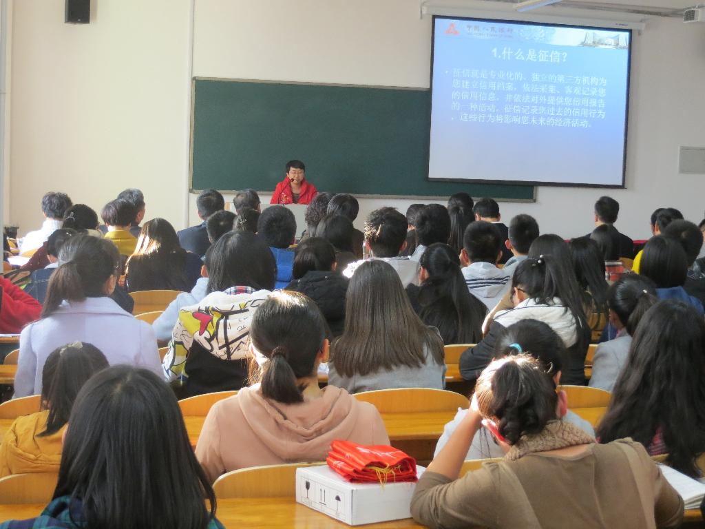 活动仪式由经济系副主任闫二旺教授主持,经济系主任赵满华教授致欢迎词,并对八家金融机构的支持表示衷心的感谢。中国人民银行晋中市中心支行刘贵斌行长代表金融机构讲话,并阐述了信用体系建设的重要性;中国人民银行太原中心支行征信管理处吴涛处长围绕什么是征信、征信的途径及如何防止校园诈骗、网络诈骗特点等热点问题进行了宣讲。宣讲结束后,中国人民银行太原中心支行征信管理处向学生赠送了征信宣传书籍。(郝瑞花)