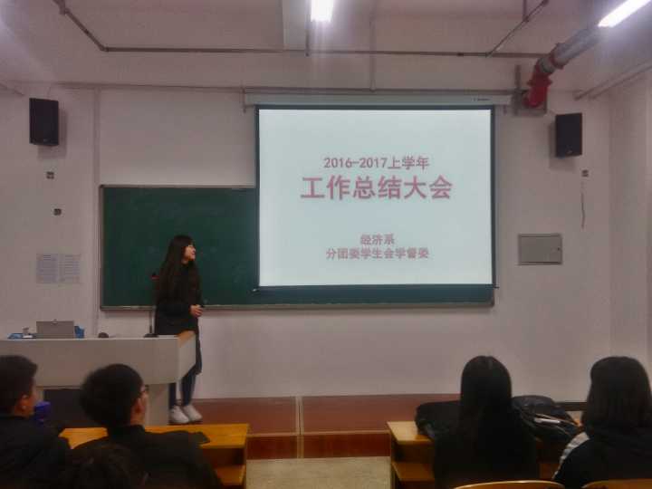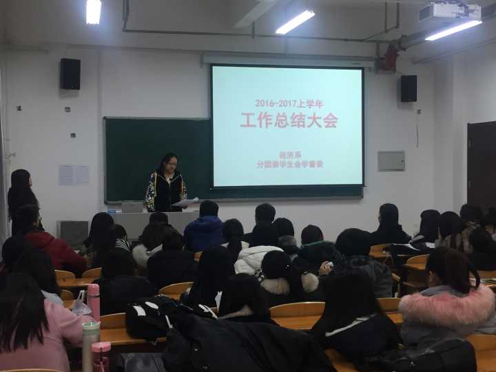 我系在今天下午六点半于文科楼B113举办了2016――2017上半年经济系分团委学生会学督委工作总结大会,到场参加的有分团委副书记李婷,学生会主席韩孟钰,学督委主任韩数,分团委秘书长申倩,学生会副主席董建琪、闫颖洁、侯轶伦,学督委副主任崔佳丽、赵煜辉,分团委副秘书长胡冰洋,以及经济系分团委学生会学督委所有部门的部长和副部长。